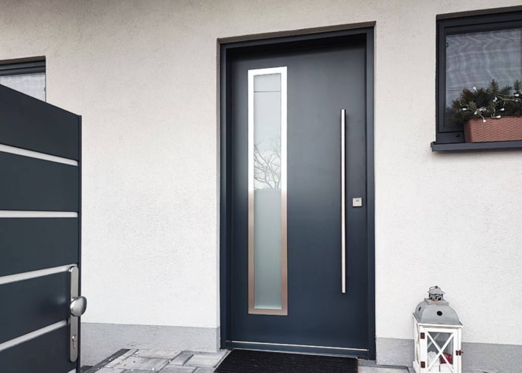 ADLO - Security Termo door Teduo, glass PS370, top skylight, atypical door pull, door surface RAL 7015