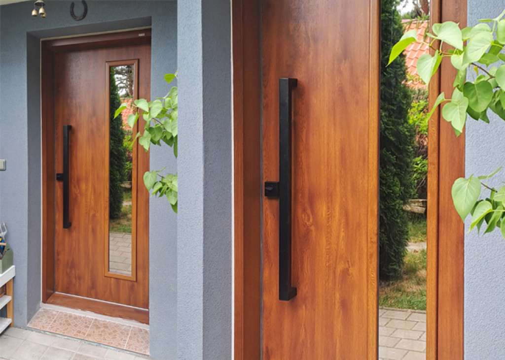 ADLO - Exterior Termo door, glass P370, Golden Oak surface, black vertical doorpull