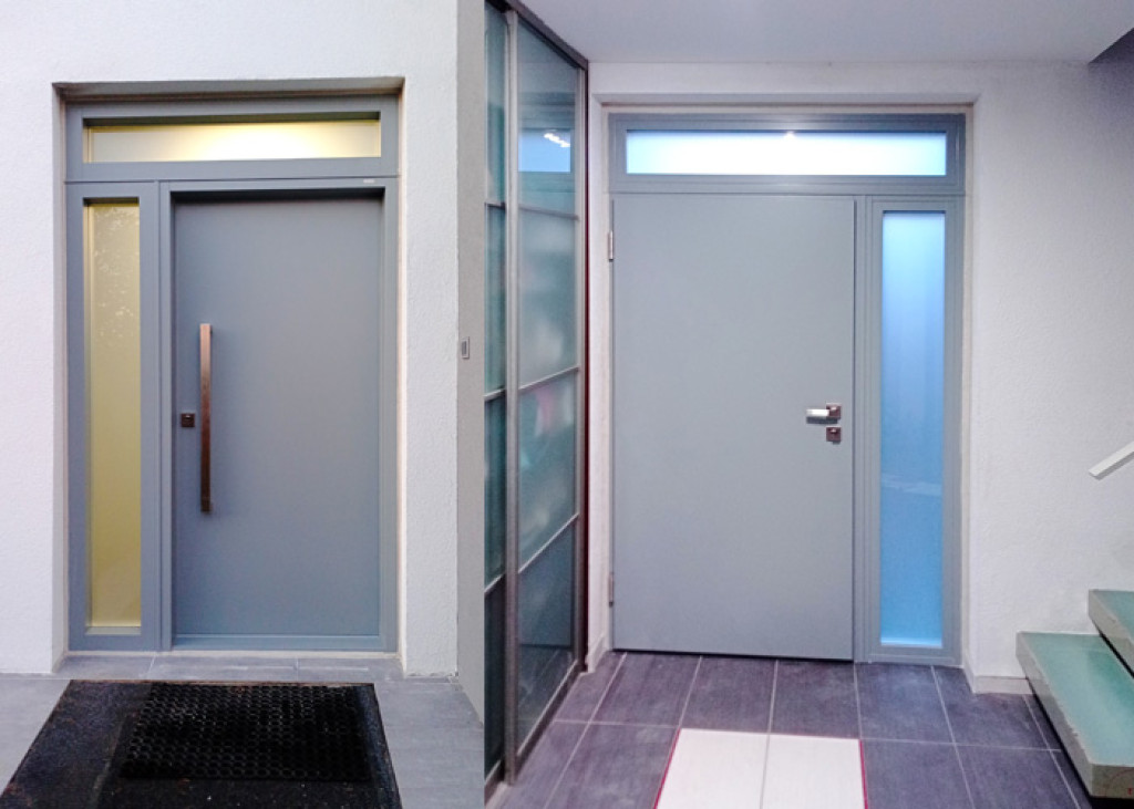 ADLO exterior Termo door TESIM with skylights, door and doorframe surface RAL 7011 matt